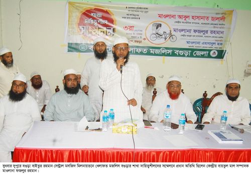 বুধবার দুপুরে বগুড়া বাইতুর রহমান সেন্ট্রাল মসজিদ মিলনায়তনে খেলাফত মজলিস জেলার অধীনে সকল শাখা দায়িত্বশীলদের নিয়ে সম্মেলন মাওলানা এহসানুল হকের সভাপতিত্বে অনুষ্ঠিত হয়। জেলা সেক্রেটারি ইউসুফ হাবিবের পরিচালনায় সম্মেলনে প্রধান অতিথি ছিলেন কেন্দ্রীয় বায়তুল মাল সম্পাদক মাওলানা ফজলুর রহমান।