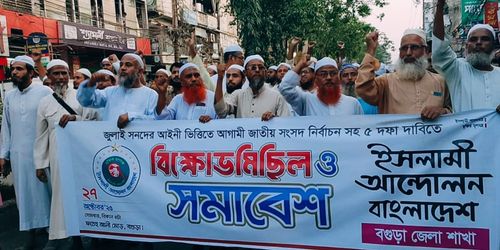 ইসলামী আন্দোলন বাংলাদেশ বগুড়া জেলা শাখার উদ্যোগে সোমবার বিকেলে বগুড়া শহরের ফতেহ আলী মোড়ে জেলা সভাপতি আ.ন.ম মামুনুর রশীদ এর সভাপতিত্বে ও জেলা সেক্রেটারী অধ্যাপক শফিকুল ইসলাম শফিকের সঞ্চালনায় জুলাই জাতীয় সনদের আইনী ভিত্তি, পিআর পদ্ধতিতে জাতীয় নির্বাচনসহ ৫ দফা দাবিতে কেন্দ্রীয় ঘোষিত বিক্ষোভ মিছিল ও সমাবেশে প্রধান অতিথির বক্তব্যদেন কেন্দ্রীয় নায়েবে আমীর আল্লামা আব্দুল হক আজাদ। তিনি বলেন, জুলাই সনদের আইনী ভিত্তিতে আগামী জাতীয় সংসদ নির্বাচনসহ ৫ দফা দাবী বাস্তবায়ন করতে হবে। সমাবেশে আরো বক্তব্য রাখেন, জেলা সহ-সভাপতি প্রিন্সিপাল মাওলানা আব্দুল মতিন, জয়েন্ট সেক্রেটারী অধ্যাপক মুফতী এমদাদুল হক, যুগ্ম সাধারণ সম্পাদক অধ্যাপক শাহজাহান তালুকদার, জাতীয় ওলামা মাশায়েখ আইম্মা পরিষদ, জেলা শাখার সাধারণ সম্পাদক-মাওলঅনা রেজাউল করীম, ইসলামী যুব আন্দোলনের সভাপতি মো: সোহরাব হোসেন, শ্রমিক আন্দোলনের সাধারণ সম্পাদক মো: আবু সাঈদ, ইসলামী ছাত্র আন্দোলনের সাধারণ সম্পাদক মুহাম্মাদ সোহেল রানা, প্রচার সম্পাদক আবুল বাশার প্রমুখ।