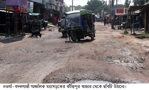 নওগাঁ-বদলগাছী আঞ্চলিক মহাসড়কের কাজের সময় শেষ হয়েছে আরো প্রায় দুই মাস আগে। যেখানে ৭কিলোমিটারের মধ্যে প্রায় ২ কিলোমিটার সড়কের কাজ এখনো বাঁকী। সদর উপজেলার ঠ্যাংভাঙ্গা মোড়, পাহাড়পুর বাজার ও র্কীত্তিপুর বাজার সড়কের দৈর্ঘ্য প্রায় ২ কিলোমিটার। এ তিনটি জায়গায় সড়কের পিচ ও ইটের খোয়া উঠে ছোট-বড় খানাখন্দে পরিনত হয়েছে। সময়ের মধ্যে কাজ শেষ না হওয়ায় ভাঙা সড়কে ছোট-বড় যানবাহন চলছে হেলেদুলে। এতে মাঝেমধ্যে ঘটছে দূর্ঘটনা। বর্ষায় খান্দাখন্দে বৃষ্টির জমে থাকা পানি, আর শুষ্ক মৌসুমে ধুলাবালি। এতে বেড়েছে জনদূর্ভোগ। ভাঙা সড়কে চলাচলে প্রায় ভ্যান ও বাসের যন্ত্রাংশ নষ্ট হচ্ছে। এতে আয়ের একটি অংশ চলে যাচ্ছে যন্ত্রাংশ মেরামতে।