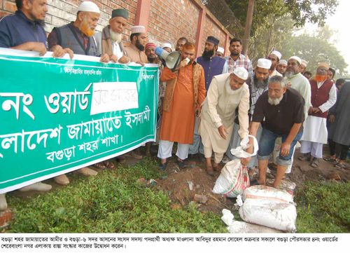 বগুড়া বিটাক ভবনের পিছনে পৌরসভার ৪নং ওয়ার্ডের শেরেবাংলা নগর এলাকা রাস্তা বর্ষায় ১০০ মিটার ধ্বসে গেছে। দীর্ঘদিন এলাকাবাসী বাড়ী থেকে অনেক দুর ঘুরে যাতায়াত করতেন। তাই রাস্তাটি সংস্কারের উদ্যোগ নেয় ৪নং ওয়ার্ড জামায়াত। শুক্রবার সকালে সংস্কার কাজের উদ্বোধন করেন বগুড়া শহর জামায়াতের আমীর ও বগুড়া-৬ সদর আসনের সংসদ সদস্য পদ প্রার্থী অধ্যক্ষ মাওলানা আবিদুর রহমান সোহেল। উপস্থিত ছিলেন ৪ নং ওয়ার্ডের আমীর মাওলানা আবদুল কুদ্দুস, নায়েবে আমীর ডা. মুস্তাফিজুর রহমান, সেক্রেটারি মাওলানা মমিনুল ইসলাম, ১৬ নং ওয়ার্ডের নায়েবে আমীর আলাউল হক, শ্রমিক কল্যান ফেডারেশন ৪নং ওয়ার্ডের সভাপতি রুবেল হোসেন, মিজানুর রহমান মুরাদ, ইবাদুর রহমান, মাওলানা আবু তাহের, মাহবুবুর রহমান, যুবনেতা তোফায়েল আহমেদ, মাওলানা আবদুস সামাদ প্রমুখ।
