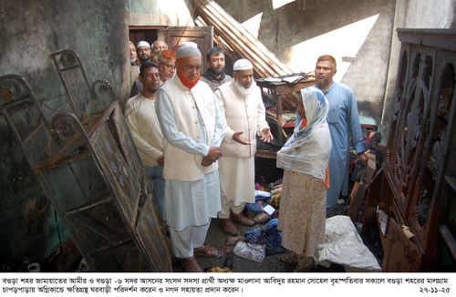 বগুড়া শহর জামায়াতের আমীর ও বগুড়া-৬ সদর আসনের সংসদ সদস্য প্রার্থী অধ্যক্ষ মাওলানা আবিদুর রহমান সোহেল বৃহস্পতিবার সকালে মালগ্রাম চাপড়পাড়ায় অগ্নিকান্ডে ক্ষতিগ্রস্থ ঘরবাড়ী পরিদর্শন করেন ও অর্থ সহায়তা প্রদান করেন। এ সময় উপস্থিত ছিলেন শহর সেক্রেটারী অধ্যাপক আ স ম আব্দুল মালেক, ১৪নং ওয়ার্ড সভাপতি অধ্যাপক আবু হানিফ, সেক্রেটারী গোলাম আযম, শ্রমিক নেতা নুর আলম, আবু সাঈদ, আব্দুল হাকিম যুব বিভাগের সভাপতি আবুল কাশেম, রিকসা ভ্যান শ্রমিক নেতা জাহিদুল ইসলাম প্রমুখ। গত বুধবার দুপুরে মালগ্রাম চাপড়পাড়ায় পেয়ারা বেওয়া ও তার ছেলেদের ৪ টি বসতবাড়ীতে ভয়াবহ অগ্নিকান্ডে পুড়ে ছাই হয়ে যায়। খবর পেয়ে বৃহস্পতিবার ঘটনাস্থল পরিদর্শন করেন জামায়াত নেতৃবৃন্দ। এ সময় নেতৃবৃন্দ পরিবারকে শান্তনা দেন।