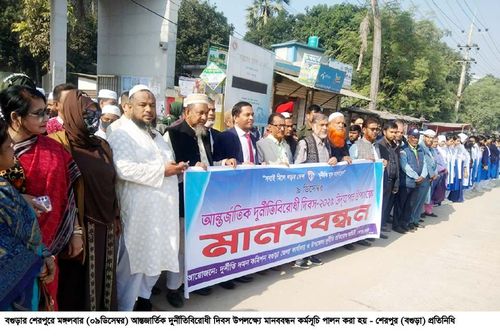 বগুড়ার শেরপুরে দুর্নীতি না করার শপথ নিলেন নানা শ্রেণীপেশার মানুষ। মঙ্গলবার (০৯ডিসেম্বর) আন্তর্জাতিক দুর্নীতি বিরোধী দিবসের অনুষ্ঠানে ওই শপথ নেন তাঁরা। ‘দুর্নীতির বিরুদ্ধে তারুণ্যের একতা, গড়বে আগামীর শুদ্ধতা’-এই প্রতিপাদ্যকে সামনে রেখে দিবসটিকে ঘিরে উপজেলা প্রশাসন ও উপজেলা দুর্নীতি প্রতিরোধ কমিটি নানা কর্মসূচির আয়োজন করেন। সকাল দশটায় জাতীয় সংগীত গেয়ে জাতীয় ও দুদকের পতাকা উত্তোলন করা হয়। পরে উপজেলা পরিষদের সামনে ঢাকা-বগুড়া মহাসড়কের পশ্চিমপাশে দুর্নীতি বিরোধী মানববন্ধন কর্মসূচি পালন করা হয়। এরপর উপজেলা পরিষদের সভাকক্ষে অনুষ্ঠিত হয় আলোচনাসভা।