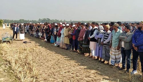 জানাজার নামাজের ইমাতি করেন কাজী মাওলানা মিজানুর রহমান। ইমাম সাহেব জানাজা শেষে যখন তাকবির দিলেন, মানুষ হাত তুলল দোয়ার ভঙ্গিতে। হাজারো কণ্ঠে দোয়া অনুষ্ঠিত হলো। সবাই তার মাগফিরাতের জন্য দোয়া করেন। একই সঙ্গে তার পরিবারকে আল্লাহ ধৈর্য ধরার তৌফিক দান করেন- এমন দোয়াও সবাই করেছেন।