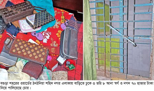 বগুড়া শহরের ৭নং ওয়ার্ডের ঠনঠনিয়া শহিদ নগর এলাকায় একটি বাড়িতে ঢুকে ৩ ভরি ৮ আনা স্বর্ণ ও নগদ ৭০ হাজার টাকা নিয়ে পালিয়েছে চোর।