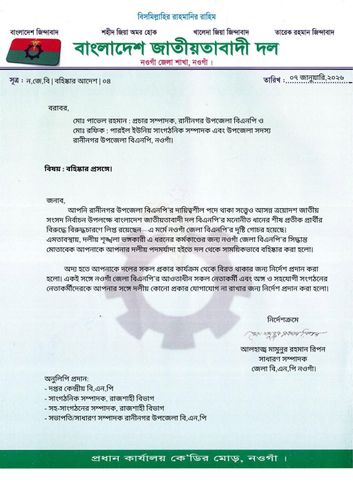 বহিস্কার আদেশে বলা হয়- উপজেলা বিএনপির দায়িত্বশীল পদে থাকা সত্ত্বেও আসন্ন ত্রয়োদশ জাতীয় সংসদ নির্বাচন উপলক্ষে বিএনপির মনোনীত ধানের শীষ প্রতীক প্রার্থীর বিরুদ্ধে বিরুদ্ধচারণে লিপ্ত রয়েছেন। এই মর্মে নওগাঁ জেলা বিএনপির দৃষ্টি গোচর হয়েছে। এমতাবস্থায় দলীয় শৃঙ্খলা ভঙ্গকারী এ ধরণের কর্মকান্ডের জন্য জেলা বিএনপির সিদ্ধান্ত মোতাবেক দলীয় পদমর্যাদা হইতে দল থেকে তাদের দুইজনকে সাময়িকভাবে বহিস্কার করা হলো।