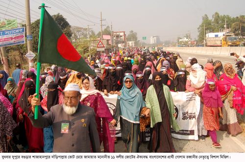 বগুড়া-৭ আসনে জামায়াত প্রার্থীর দাঁড়িপাল্লা নিয়ে হাজারো নারীর রাজপথে মিছিল