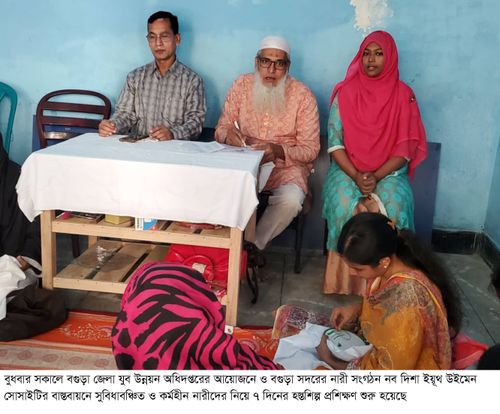 উদ্বোধনের পর বগুড়া শহরের আজিজুল হক কলেজ রোড (পুরাতন) এর সুবিল ব্রীজ সংলগ্ন সাধারণ বীমা ভবনের নিচতলায় নব দিশা ইয়ূথ উইমেন সোসাইটির কার্যালয়ে নারীদের প্রশিক্ষণ হাতে কলমে শুরু করা হয়। এই প্রশিক্ষণে যুব উন্নয়নসহ বিভিন্ন প্রশিক্ষকগণ হাতের কাজের সেলাই, হ্যান্ড এমব্রয়ডারির প্রশিক্ষণের পাশাপাশি শিশুদের, নারীদের পোষাকে বিভিন্ন রঙিন সুতায় ফুল তোলার প্রশিক্ষণ প্রদান করা হবে। প্রশিক্ষণে থাকছে কাশ্মরী ভরাট, গুজরাটি, লেজিডেইজি, মাছকাটা, ডালফোড়, চেইনফোড়, কাথাস্টিজ, বোতামস্টিজ, মাদ্রাজীস্টিজ, যশোরস্টিজসহ বিভিন্ন প্রকার সুঁইসুতার কাজও করা হবে।
