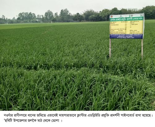 সংশ্লিষ্ট তথ্যমতে, প্রতি দুই একর জমিতে ধান রোপনের ১২-১৫ দিনের মধ্যে জমির চারটি ধানের গোছার মাঝখানে এডব্লিউডি ১০ইঞ্চির ৬টি পিভিসি পাইপ স্থাপন করতে হবে। ১০ইঞ্চি পাইপের ৬ইঞ্চি ছিদ্রযুক্ত অংশ মাটির নিচে এবং ৪ইঞ্চি মাটির উপরে থাকবে। জমিতে একবার সেচ দেয়ার পর যতক্ষন পর্যন্ত পাইপের ভিতরের তলায় পানি দেখা যাবে ততক্ষন নতুন করে সেচের প্রয়োজন হবেনা। এভাবেই ধান রোপনের পর থেকে থোর আসা পর্যন্ত সেচ দিতে হবে। এছাড়া থোর আসার পর থেকে জমিতে হালকা পানি রাখতে হবে। এতে প্রায় ৩৫-৫০শতাংশ পর্যন্ত কম পানি সেচ দিয়ে কাঙ্খিত ফলনসহ ধান ঘরে তোলা যায়। এতে একদিকে যেমন ভূগর্ভস্থ পানির অপচয় কম হয়,অন্যদিকে ধানে রোগ বালাই রোধসহ ফলন ভাল পাওয়া যায়। এই প্রদর্শনীর মাধ্যমে প্রযুক্তির ব্যবহারে কৃষকদের উদ্বদ্ধ করতে সরকার এমন উদ্যোগ নিলেও শুধুমাত্র কৃষকদের উপকরণ দিয়েই খ্যান্ত হয়ে পরেছেন কৃষি কর্মকর্তারা। কৃষকরা বলছেন,জমিতে কিভাবে পাইপ স্থাপন করতে হয় বা কি নিয়মে পানি সেচ দিতে হয় কৃষি অফিস থেকে এসব কিছুই জানানো হয়নি। ফলে বরাবরের মতোই জমিতে সেচ দিয়ে ধান চাষ করছেন তারা।