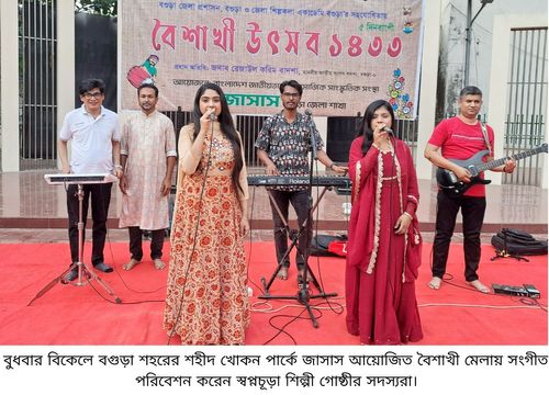 বুধবার বিকেলে বগুড়া শহরের শহীদ খোকন পার্কে কেন্দ্রীয় শহীদ মিনার চত্বরে জাসাস আয়োজিত ৫ দিনব্যাপী বৈশাখী মেলার ২য় দিনে মনোজ্ঞ সংগীত পরিবেশন করেন স্বপ্নচূড়া শিল্পী গোষ্ঠীর শিল্পীরা। মঙ্গলবার সকালে এ মেলার উদ্বোধন করেন বগুড়া সদর আসনের সংসদ সদস্য রেজাউল করিম বাদশা।