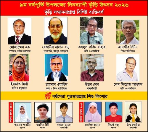 বগুড়া জেলা পরিষদ মিলনায়তনে অনুষ্ঠিত হতে যাওয়া অনুষ্ঠানে এ বছর কুঁড়ি সম্মাননা পাচ্ছেন শিশু সংগঠক দৈনিক করতোয়া সম্পাদক মোজাম্মেল হক, সাংবাদিকতায় বগুড়া প্রেসক্লাবের সভাপতি রেজাউল হাসান রানু, শিশু সাহিত্যপ্রমী কবি ও প্রাবন্ধিক বজলুল করিম বাহার, শিশু সাহিত্যে আনজীর লিটন, শিশুতোষ ছড়ায় ইসমাত মির্যা, শিশুতোষ গল্পে রাহমান ওয়াহিদ, প্রচ্ছদশিল্পে উত্তম সেন এবং শিশু সাহিত্যে বিশেষ অবদানে কবি ও প্রাবন্ধিক শেখ ফিরোজ আহমদ। এবং শিশু-কিশোর খুদে লিখিয়েদের মধ্যে বর্ষসেরা কুঁড়ি পুরস্কার পাচ্ছে ছড়াকার শাহানাজ পারভীন রূপা ও মাসফিয়া জাহান মায়িসা, গল্পকার তাহসিনা বিথী ও সিদ্ধার্থ সাহা, প্রচ্ছদশিল্পী সালমান রহমান সিয়াম ও উম্মে রুকাইয়া।